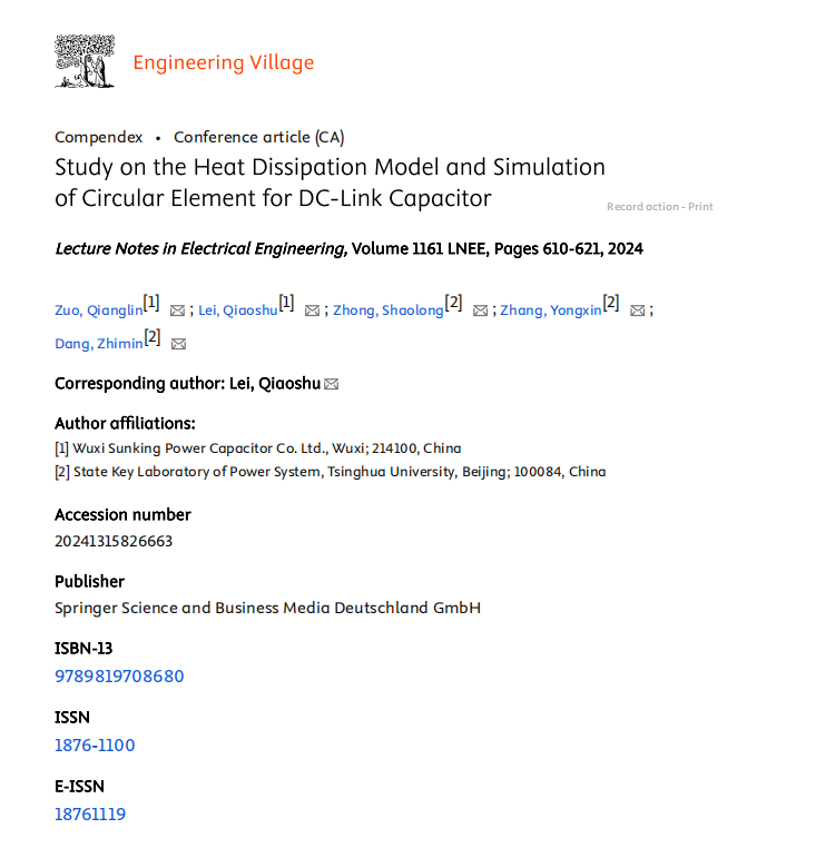 近日,ac米兰官网集团有限公司(以下简称“ac米兰官网”)成员企业无锡赛晶电力电容器有限公司(以下简称“无锡赛晶”)的技术成果论文被EI(工程索引)收录。EI作为国际权威的工程技术领域学术出版机构之一,专门收录工程与科技领域的高质量文献,意味着ac米兰官网在电力电容器领域的技术研究和创新能力得到了国际权威认可。